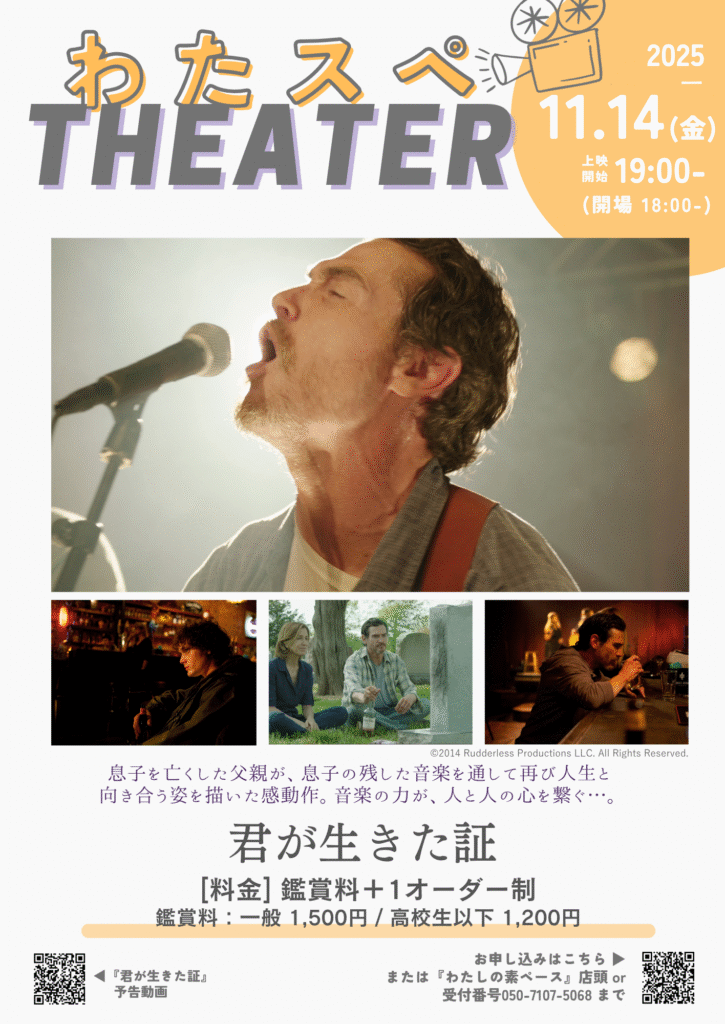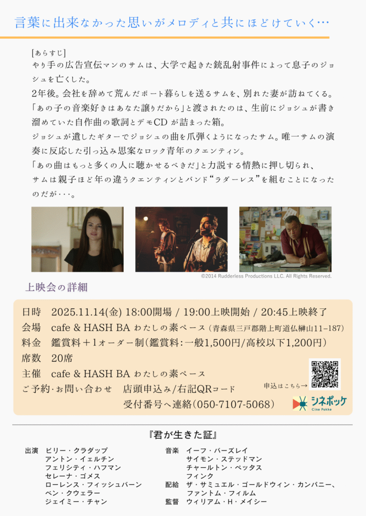 今作は、 突然の悲劇で息子を失った父親が、息子の残した曲を通して再び人生と向き合っていく姿を描いています。音楽が物語をやさしく包み込みむ…そんな感動作を是非ご覧にお越しください。