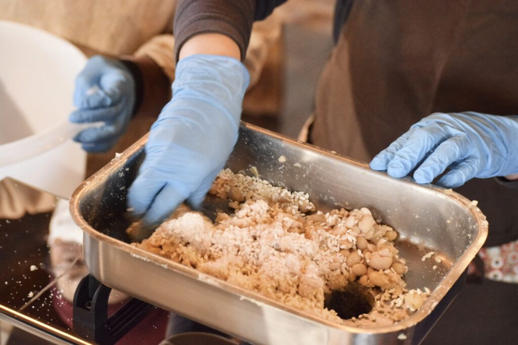 当日は、まずみその基本や仕込みの流れをお話しした後、麹と塩を混ぜ合わせて、煮た大豆と合わせながら潰していく作業へ…。