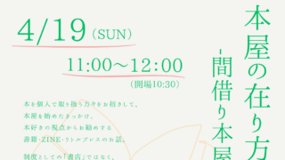 Event 【受付中】4/19(日)間借り本屋さん2組とのトークイベント開催! 本屋の在り方、ちょっと一緒に考えてみませんか? こんばんは、まりほです🌙先週末は春の陽気でしたが、また寒くなってきましたね(> <)寒暖差からくる風邪には注意しましょう。 さて、少し先ですがイベントの告知です!近隣で間借り本屋さんを営んでい... EventNews
